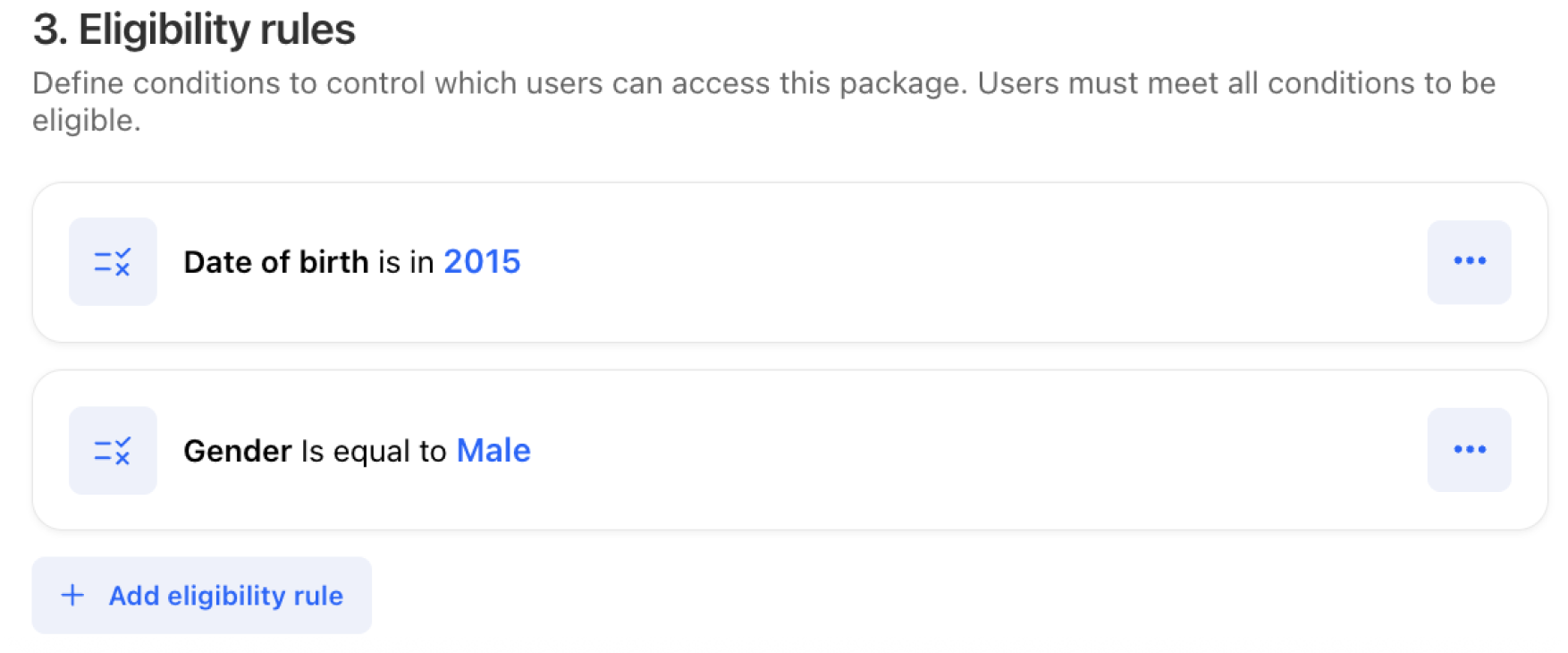 Eligibility rules are based on the questions in your registration. Depending on how someone answers — for example date of birth or gender — they will only see the packages they’re eligible for.