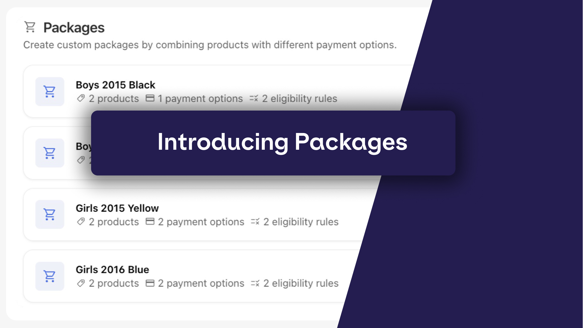 With Packages, you can combine multiple products and payment options in a single registration. Each package can have its own products, pricing and payment methods, allowing clubs to offer the right options to the right players without duplicating forms for every team, age group, or program variation.