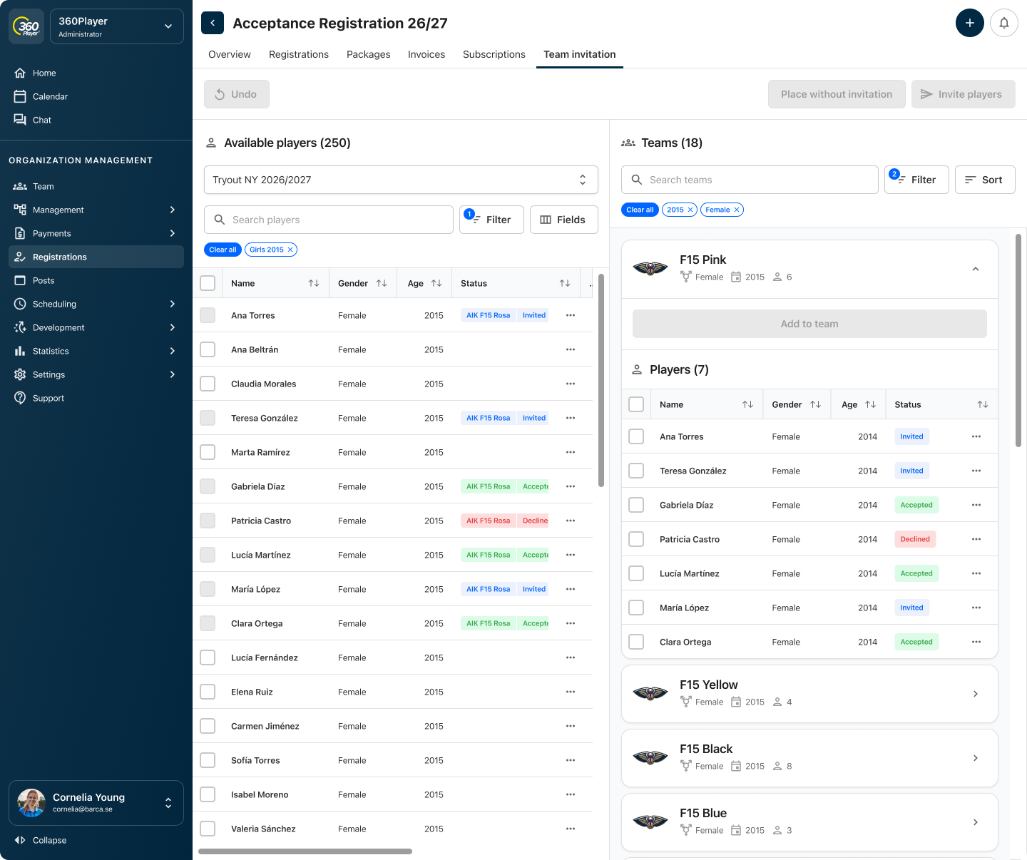 Coaches get a dedicated view where they can see all submitted registrations alongside the available player pool, and invite specific players to specific teams from the same screen. Players receive an invitation, accept or decline through their own view in the app, and the status updates automatically. No chasing, no manual status updates, no separate communication threads.